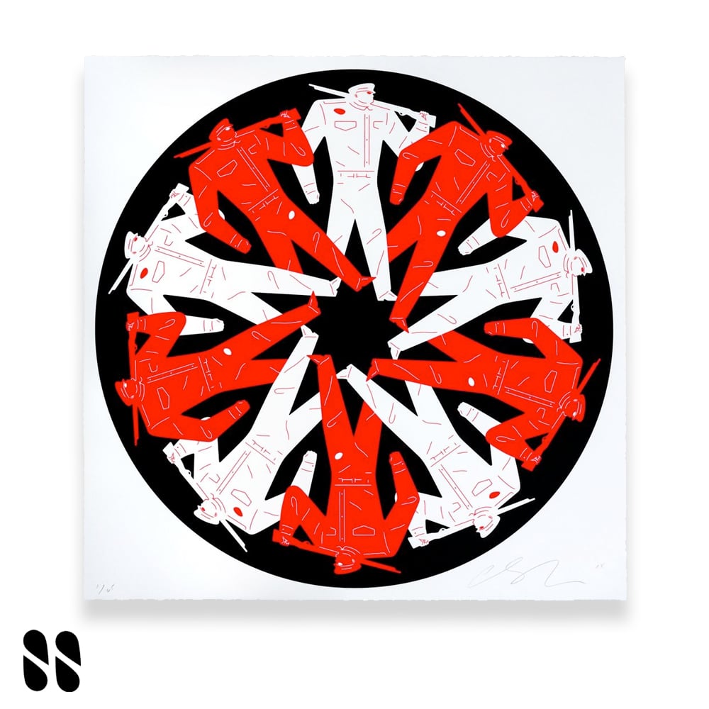 28 x 28" hand pulled black and Red screen print printed on 290gsm Coventry Rag paper with deckled edges Each print is signed and numbered limited edition of 65